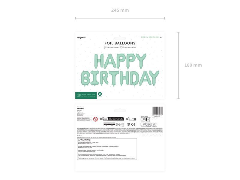 Matinė folinė girlianda HAPPY BIRTHDAY, žalia, dydis apie 340 × 35 cm (134 × 14”). Pripūsti tik oru. Balionas savaime užsandarėjantis. Yra 4 kilpos patogiam pritvirtinimui prie juostelės.
