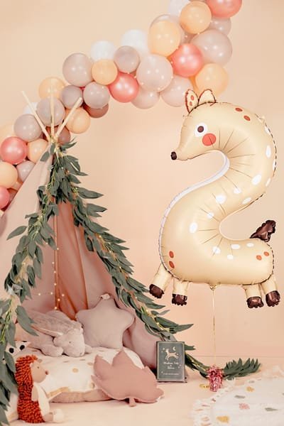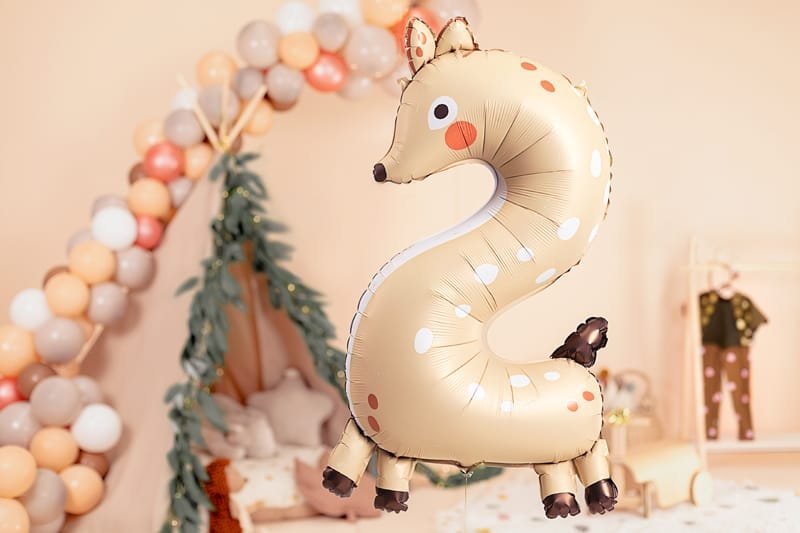 Folinis balionas skaičius „2“ – stirna, mišrios spalvos, dydis prieš pripūtimą apie 65 x 102 cm (25,5 x 40”), dydis po pripūtimo apie 50 x 88 cm (19,5 x 34,5”). Pripūsti helio ir oru. Rinkinį sudaro šiaudelis.