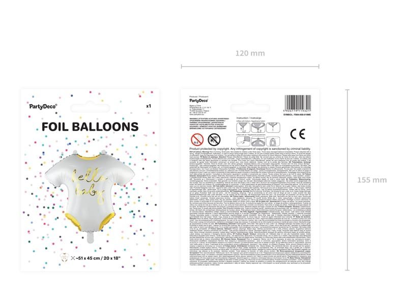 Matinis folinis balionas kūdikio kombinezono forma, baltos spalvos su metaliniu auksiniu atspaudų, dydis apie 51 x 45 cm (20 x 18”).