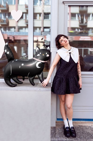 Juodos spalvos folinis balionas KATĖ su holografine spauda, dydis prieš pripūtimą apie 96 × 95 cm (37,5 × 38”), dydis po pripūtimo apie 81 × 80 cm (32 × 31,5”). Tinka pripūsti oru ir heliu. Rinkinyje yra šiaudelis.