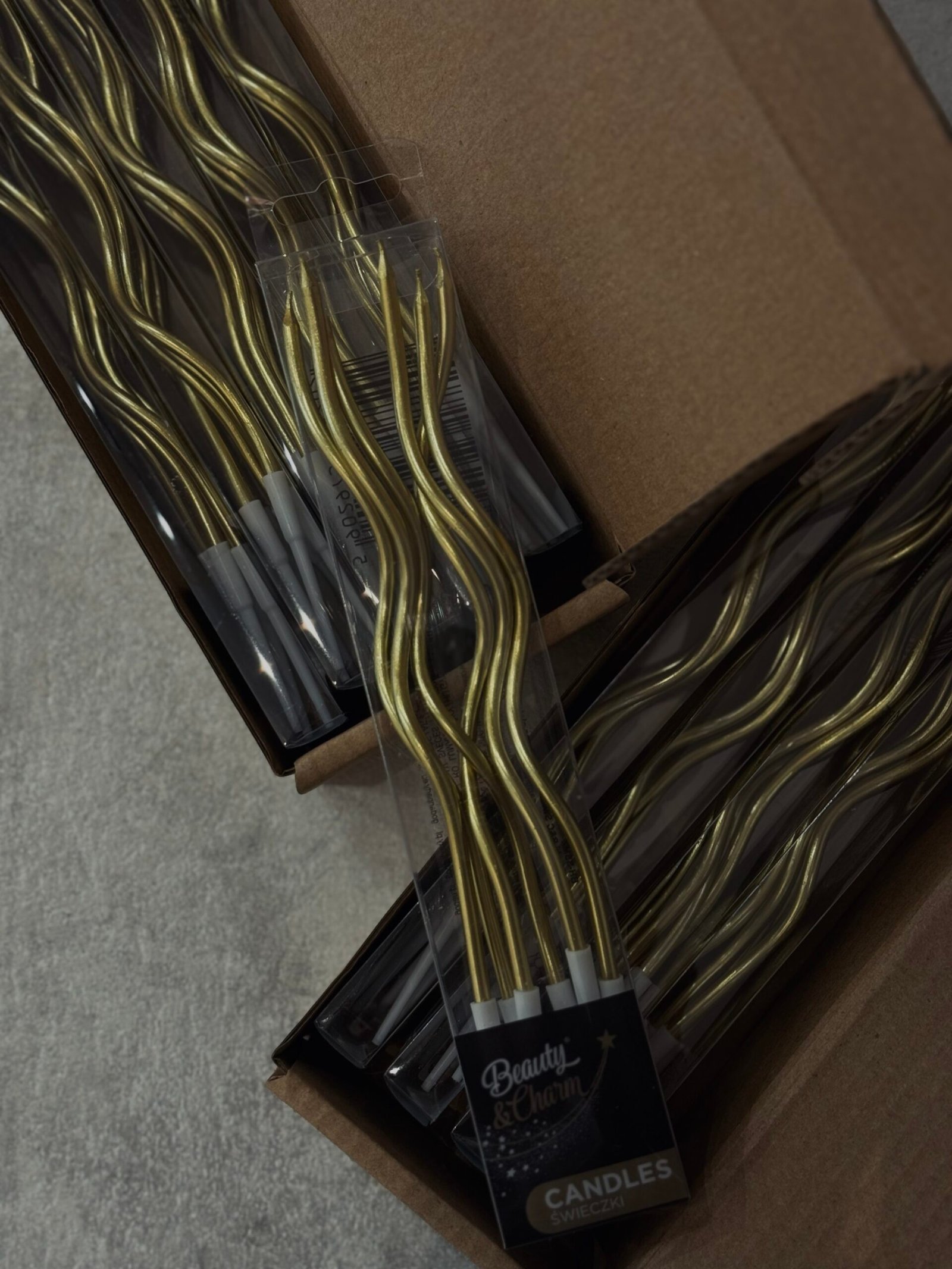 Gimtadienio žvakutės Banguotos metalizuotos auksinės spalvos, 16 cm., (1pak / 6 vnt.)