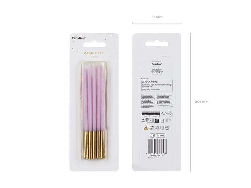 Vienodos gimtadienio žvakutės violetinės spalvos, aukštis apie 14 cm. Rinkinį sudaro 12 vnt. (1 pakuotė / 12 vnt.)