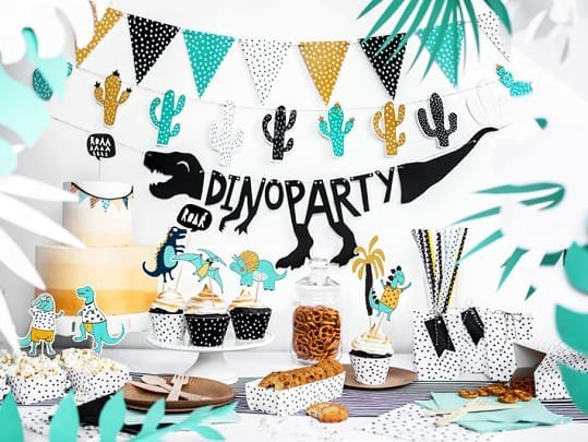 Girlianda Dinosaurs – Dino Party, pagamintas iš juodo popieriaus, pasidaryk pats, rinkinyje yra raidžių ir apytiksl. 2 m juostelė,