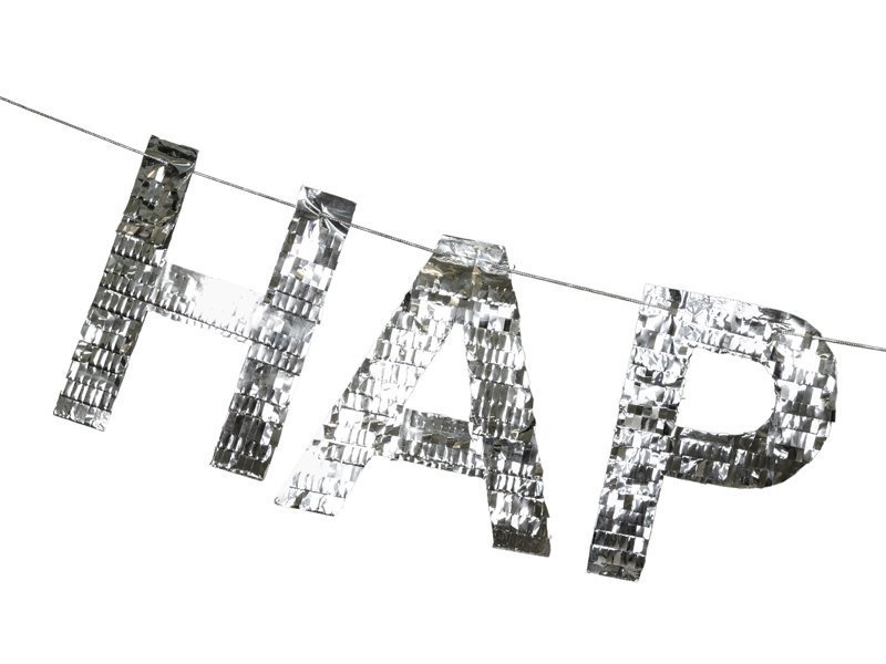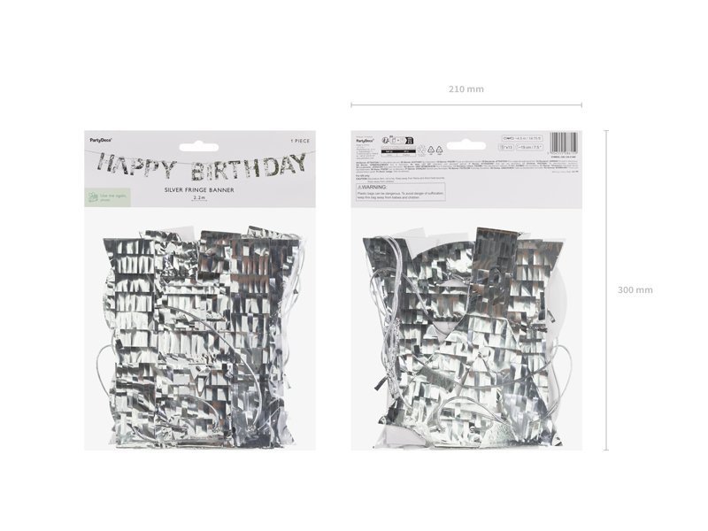 Happy Birthday Girlianda, pagaminta iš sidabrinės folijos ir popieriaus su kutais. Raidės maždaug 19 cm aukščio. „Pasidaryk pats“ rinkinį sudaro 13 raidžių ir apie 4,5 m auksinės virvelės.