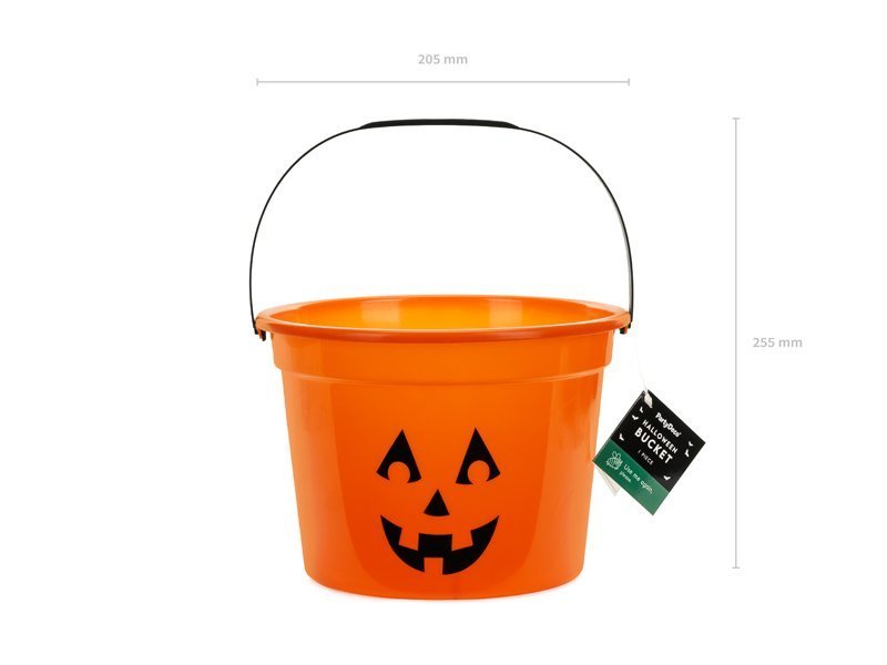 Oranžinis moliūgų kibirėlis su juodu raštu, matmenys apie 20,5 x 15 cm.