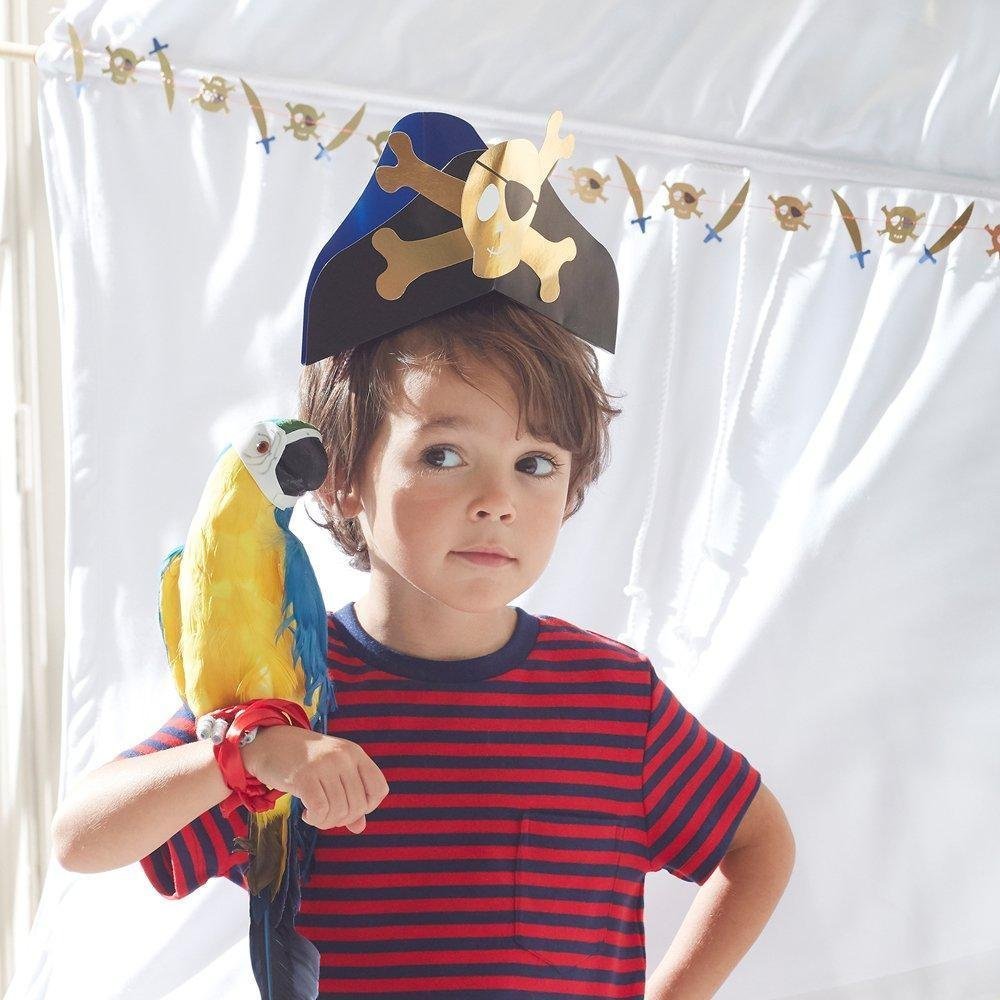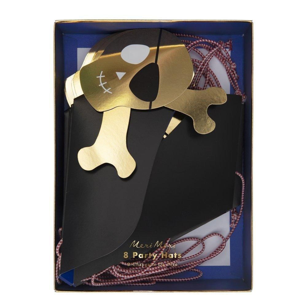 Šios vakarėlio kepuraitės su blizgančia auksine kaukole ir sukryžiuotais kaulais leis mažiesiems piratams atrodyti nepaprastai stilingai. Pakuotėje 8 vnt