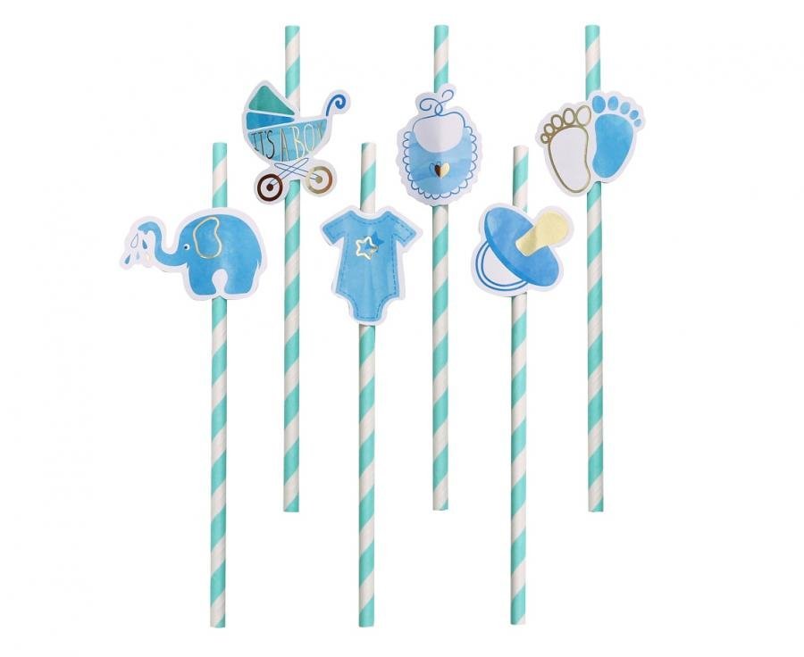 Popieriniai šiaudeliai pastelinės melsvos spalvos su vaikiškais papuošimais 20cm (1 pak / 8 vnt)