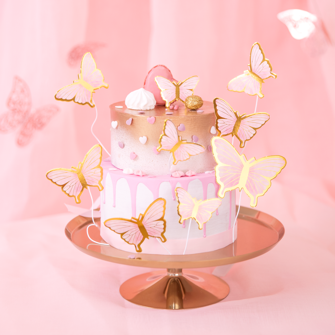Rožiniai ir auksiniai drugeliai tortui „pasidaryk pats“ 10 vnt.