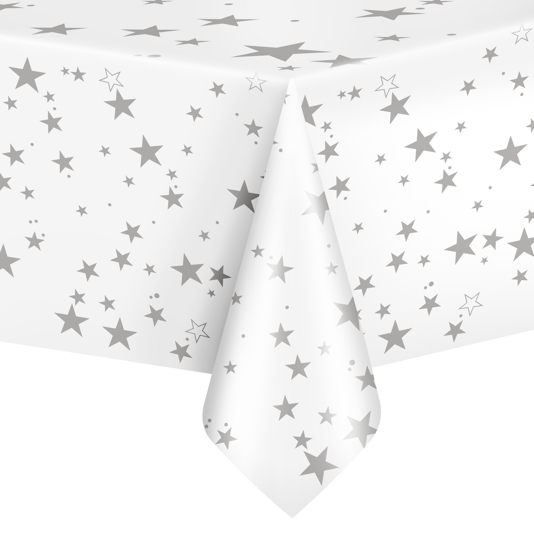 Plastmasinė Baltos spalvos staltiesė su sidabrinėmis žvaigždutėmis 137 x 274cm