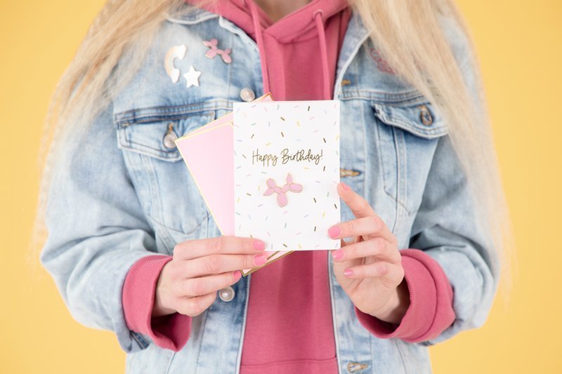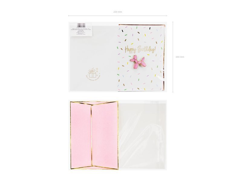 Baltos spalvos atvirutė su spalvingu atspaudu, emaliuotu smeigtuku šuniuko baliono formos ir baltu voku su aukso spalvos metaliniu atspaudu. Atvirutės dydis apie 10,5 x 14,8 cm, emaliuoto smeigtuko dydis apie 4 x 3,2 cm.