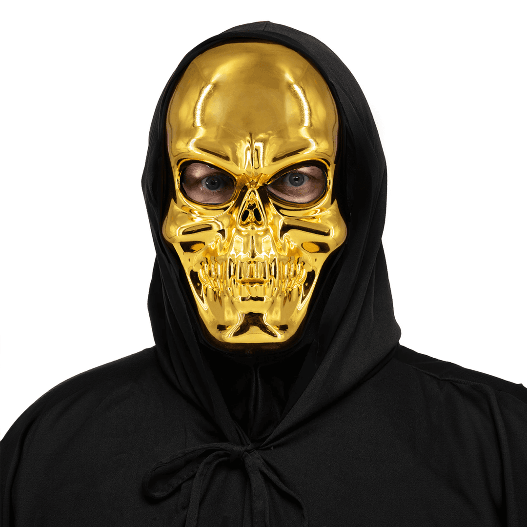 Helovyno kaukė skeletų karaliui. Auksu blizganti kaukė juodu gobtuvu tikrai patrauks kitų dėmesį.