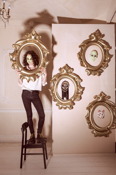 Kaukolės formos kaukė su gobtuvu, sidabrinės ir juodos spalvos, matmenys apie 18,5 x 24,5 cm, gobtuvo ilgis apie 43 cm.